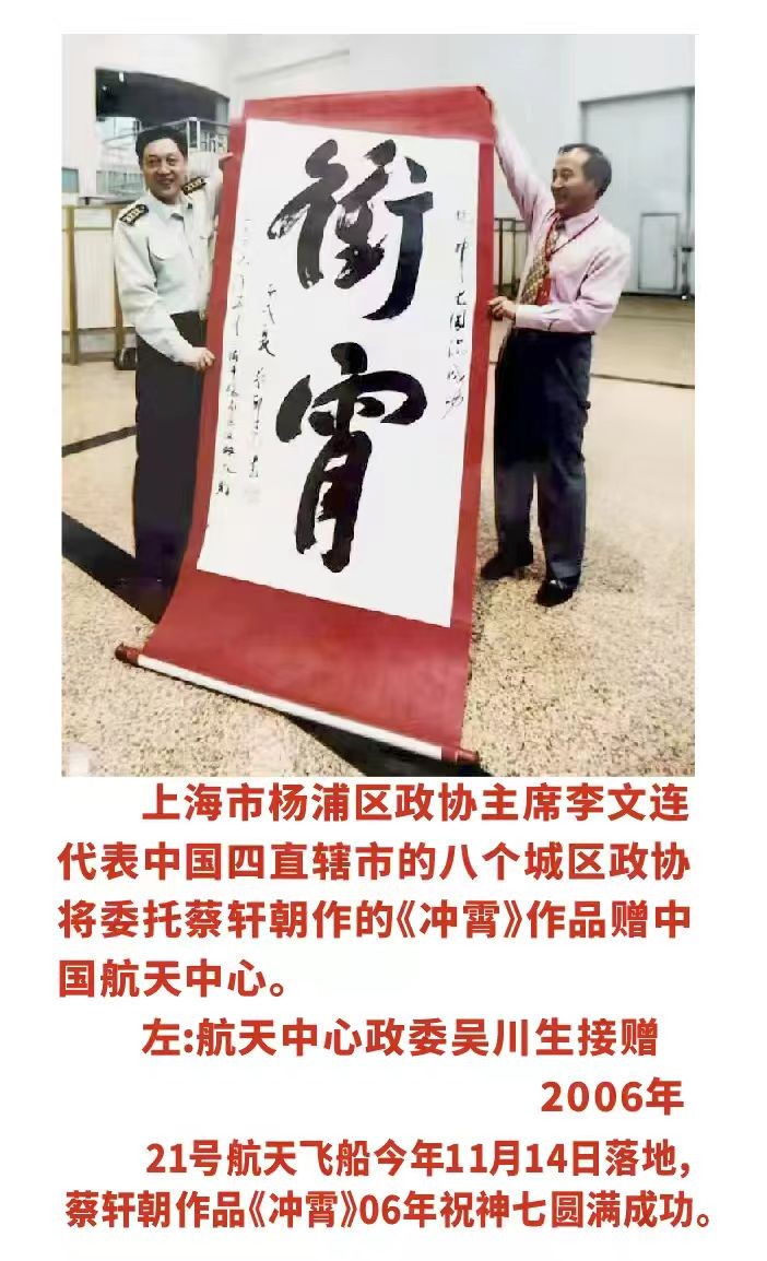 上海市杨浦区政协主席李文连将委托蔡轩朝作的《冲霄》作品赠中国航天中心。